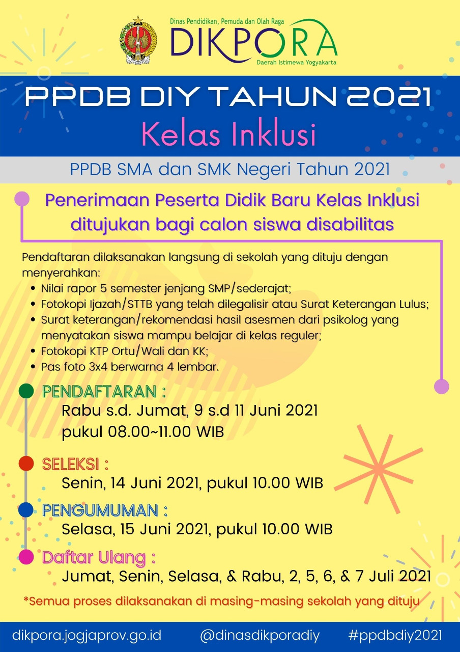 d. Pendaftaran PPDB Khusus siswa inklusi (berkebutuhan khusus) pada tanggal 9-11 Juni 2021 pukul 08.00-11.00 di sekolah yang dituju. Informasi lebih lengkap ada di selebaran.